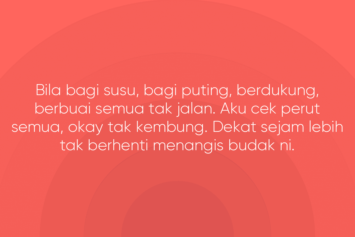 Bila bagi susu, bagi puting, berdukung, berbuai semua tak jalan. Aku cek perut semua, okay tak kembung. Dekat sejam lebih tak berhenti menangis budak ni.